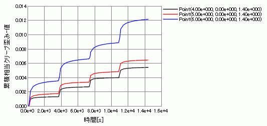 例題38の同様の結果(クリープなし)と比較すると、温度キープ時においてクリープひずみの増加に伴い