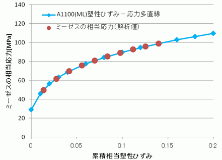 比較のため、A1100(ML)の塑性ひずみ-応力多直線データ(青プロット)も合わせてプロットしました。