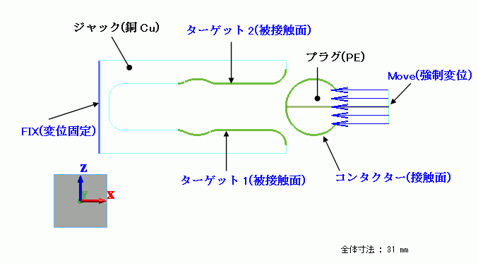 固定されたジャックに強制変位が設定されたプラグが挿入される様子を解析しています。