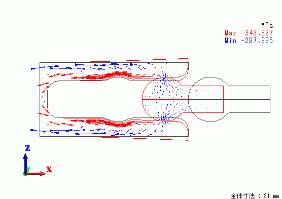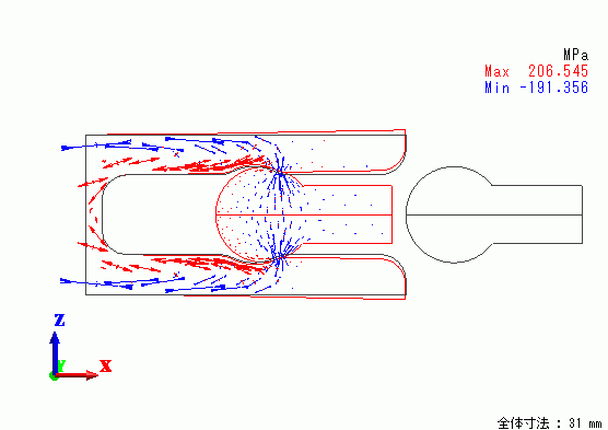 ジャックの内側には引張り応力、外側には圧縮応力が発生していることが分かります。