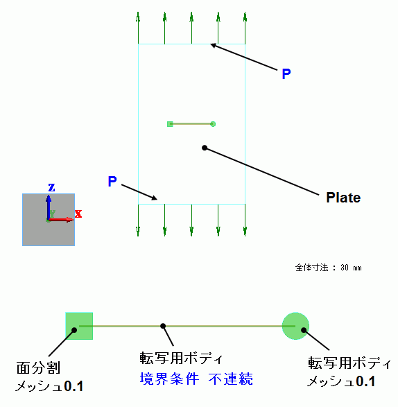 例題34では、右上1/4の領域のみの解析を行いましたが、今回は、亀裂の両端の計算を行うこと、