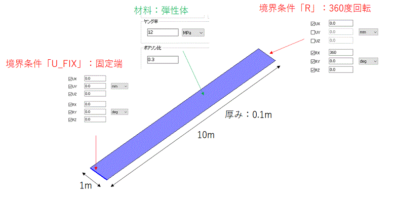 このモデルは、シェル要素の大変位モデルを考慮した幾何非線形のベンチマークとしてよく使用される「Rolling Up」モデルといいます。