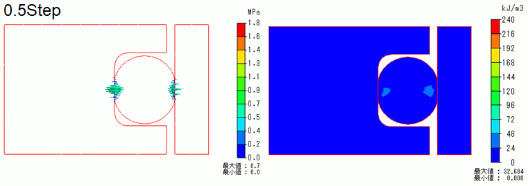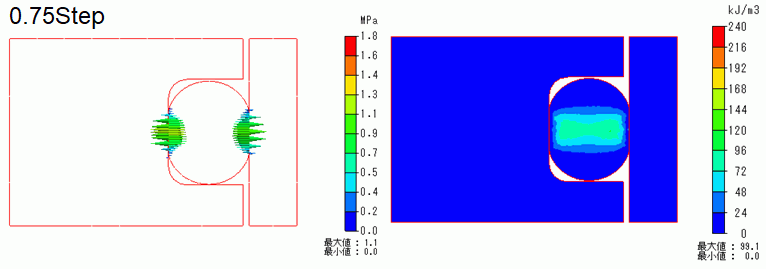 0.5ステップ、0.75ステップ、1ステップにおける接触面圧とひずみエネルギー密度の結果を示します。