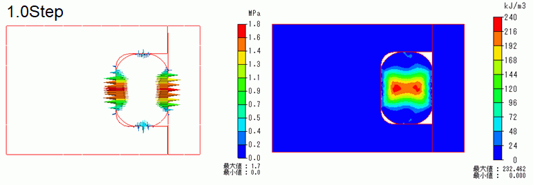 変形の状態やひずみエネルギー分布、節点接触力などを解析結果として見ることができます。