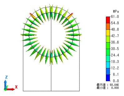 接触面圧を示します。ベクトル図は接触面での圧力の向きと大きさ示してます。単位は[Pa]です。