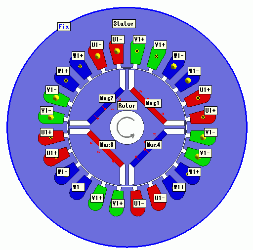 ステップ数が90で、周方向メッシュ分割角度が1.0[deg]、1ステップ当たりの回転量が1[メッシュ]ですので、機械角で90*1.0*1=90[deg]まで回転させる解析となります。