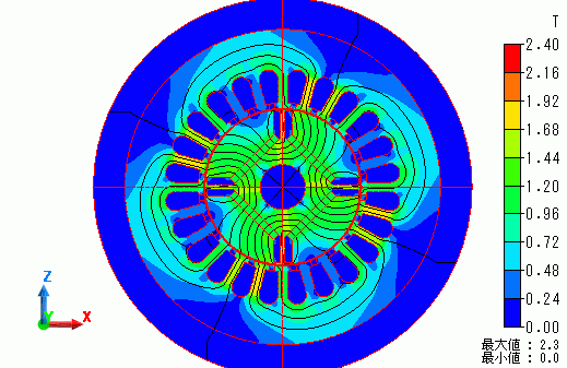 回転角度が0[deg]の時の磁束密度分布と磁束線を示します。