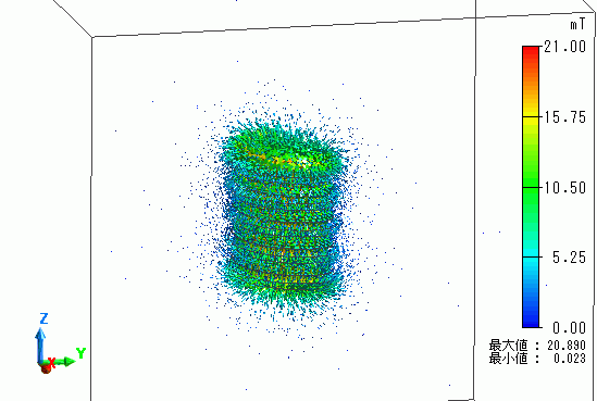 ヘリカルコイルによって発生する磁界ベクトルの解析結果を示します。