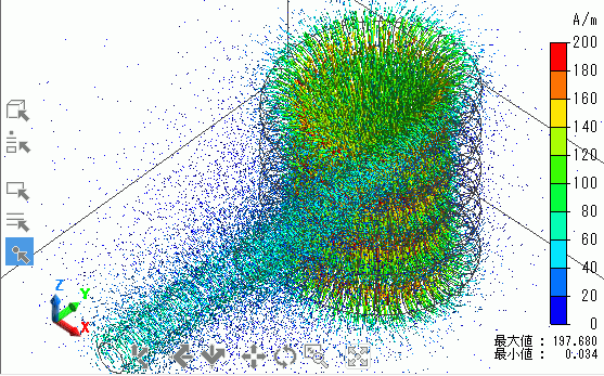 ヘリカルコイルによって発生する磁界ベクトルの解析結果を示します。