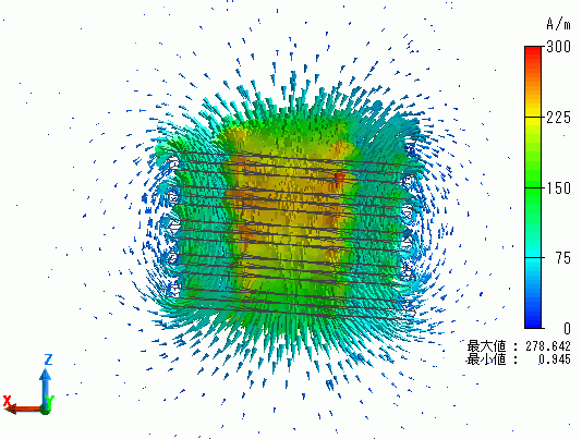 内側のコイルの内部において特に強い磁界がZ軸マイナス方向に発生しことが分かります。