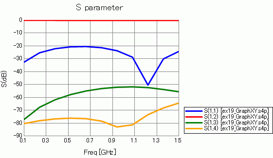 次のような、Sパラメータの周波数特性を示すグラフが表示されます。