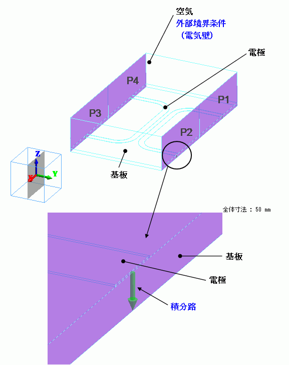 2本のマイクロストリップラインを平行に配置したモデルです。ポート1、ポート2は同一面上に並んでいます。このような