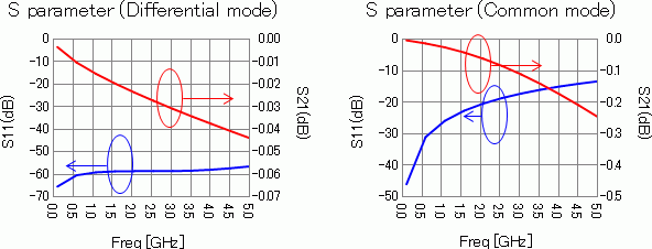 左の図が差動モードのSパラメータで、右の図がコモンモードのSパラメータです。