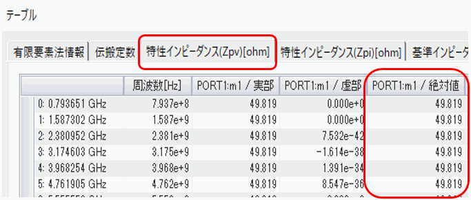 図2:解析結果テーブル(特性インピーダンス(Zpv))
