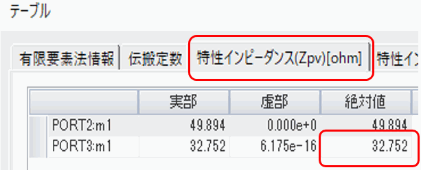 50[Ω]となることは解析結果のテーブル表示で確認することができます(図2参照)。