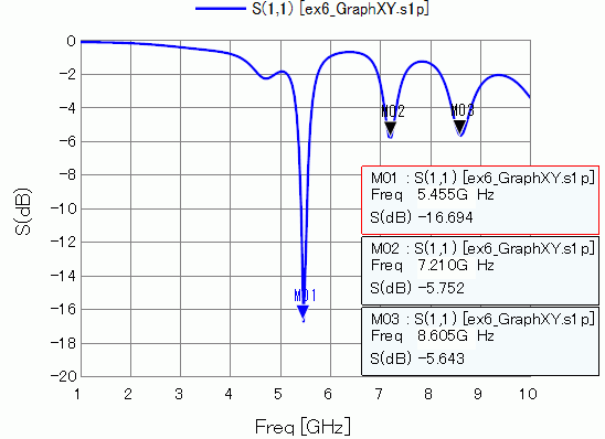 パッチアンテナ給電部における反射特性(Sパラメータ)の解析結果を示します。