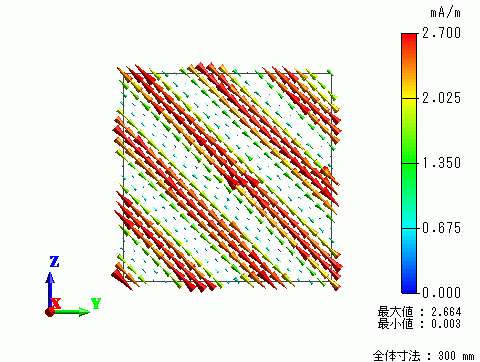 次に磁界ベクトルを見ます。最大値が2.664[mA/m]であることがカラーバーの下の表示から分かります。
