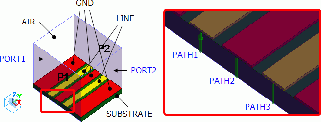 図のように、モデルの2面にポートを設定し、他の4面の外部境界は外部境界条件の電気壁が設定されます。