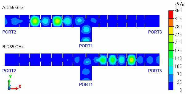 図3-Bに示されているように、285GHzでは電磁波はポート1からポート3へ伝搬し、ポート2へは伝搬しません。
