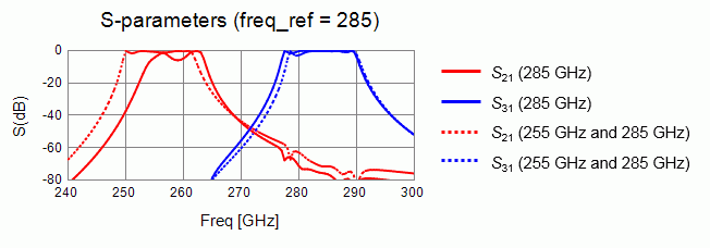 255GHzと285GHzの2周波数でアダプティブメッシュを行った場合のSパラメータを示しています。