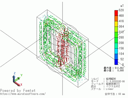 コア部分の損失や、磁界ベクトルや磁束密度ベクトルを解析結果として見ることができます。