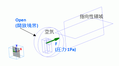 ”指向性の計算方法を使う”にチェックされたボディは、指向性計算をする領域として認識されます。このボディに材料"000_空気"を指定していますが、この材料は計算に使われません。開放境界を設定したボディの材料が、その外側に広がっているという条件で解析が行われます。