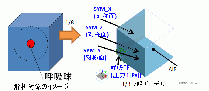 標準メッシュサイズはデフォルトの値(50)を利用しています。左側の図は、解析対象のイメージ図です。内部の点線は、通常の方法で解く領域を表しています。音源である呼吸球を含み、解析領域の内部に含まれるように作成しています。解析モデルはモデル形状の対称性を利用して、1/8のモデルとしています。