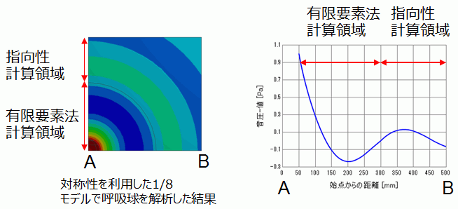 開放境界の半径で指定した内側を通常の方法(有限要素法)で解き、その外側を指向性の方法で計算します。