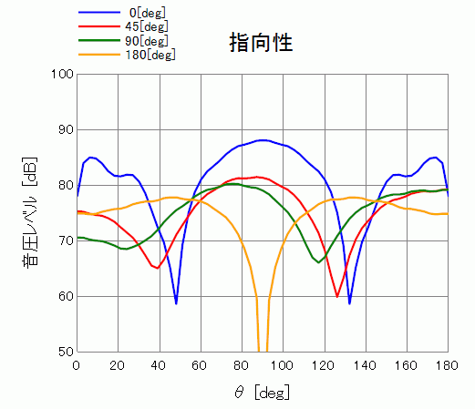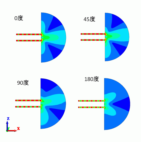 コンター図の模様が変わる事が確認できました。また、コンター図の変化に伴い、指向性も変化することを以下に示しました。