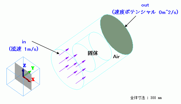 筒の中を満たす流体部分(Air)はソリッドボディで形状を作成し、材料定数で[流体]に設定しています。