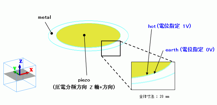 薄い円板上のアルミニウム板(metal)の上に圧電体円板(piezo)を重ねたモデルを作成し、