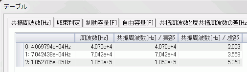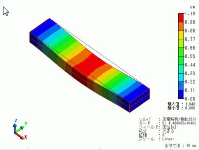 以下の計算結果が得られます。基本共振モードの周波数は4.481E+4[Hz]です。