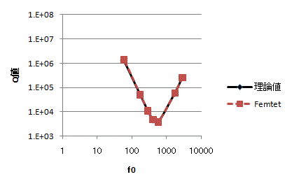 図1.共振周波数の実部とQ値の関係を、Femtetの結果と理論計算値で比較