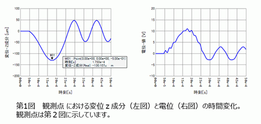 解析結果フィールドを表示し、観測点における変位(z成分)と電位の時間変化をグラフに示します。