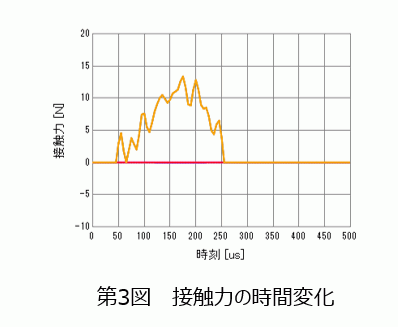 結果テーブルの”接触力[N]” というタブを選択し、グラフボタンを押すと、接触力の時間変化を表すグラフを書くことができます。