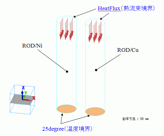 円柱のソリッドボディを2つ定義し、熱伝導率の異なる導体の組み合わせとして、それぞれ銅およびニッケルの材料を