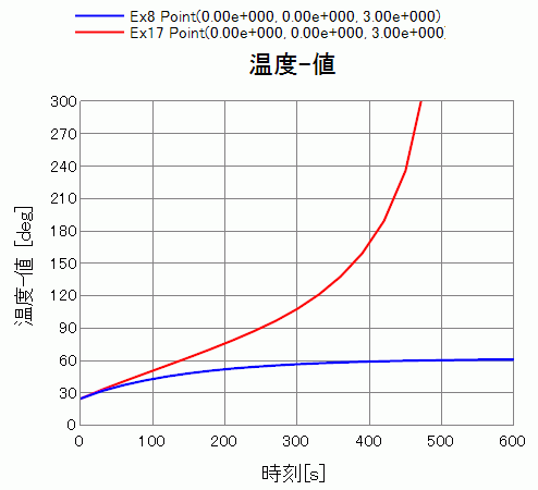300秒後、450秒後では、温度上昇により発熱量が大きくなっているため、今回の例題の方が温度が高い結果となっています。