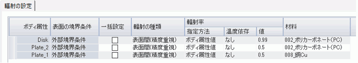 3つのボディ属性の外部境界は表面間輻射の輻射面として扱われます。また、ボディ属性毎に設定した輻射率が表示されていることが確認できます。