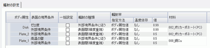 各ボディ属性表面での輻射率を以下のように設定しています。