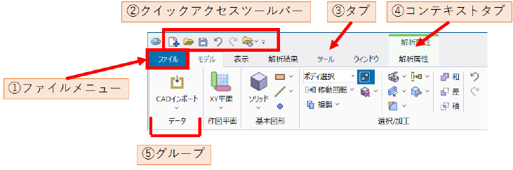 アプリケーション名(Femtet)と、現在開いているドキュメント名が表示されます。 ドキュメント名の末尾に「- 履歴制限」と付く場合があります。 未保存のモデルのドキュメントの場合、ドキュメント名の末尾に"*"が追加されます。 |