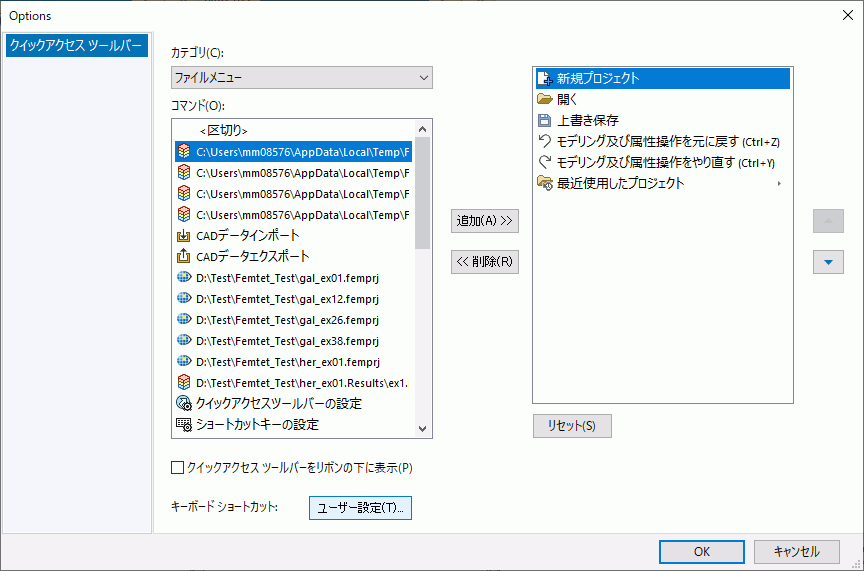 2.[Options]ダイアログ左下の[ユーザー設定]ボタンをクリック