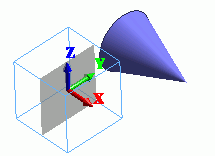 下図に円錐を例にして、作成される向きと作図平面の関係を示します。とがっている方向が「高さ」方向です。