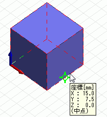 スケッチ中に中点スナップをONにしていると、既存ボディの辺上にカーソルが来た時、 その辺の中点と、中点の属するボディがハイライトされて座標値を拾うことができます。 中点がハイライトされた場合には、ツールチップに(中点)が表示されます。