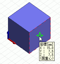 スケッチ中に面重心スナップをONにしていると、面上にカーソルが来た時、 その重心座標と、重心座標の属する面トポロジがハイライトされて座標値を拾うことができます。 面重心がハイライトされた場合には、ツールチップに(面重心)が表示されます。