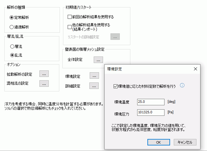チェックを入れると、流体解析では環境温度と環境圧力の設定が、熱流体解析では環境圧力の設定が可能になります。