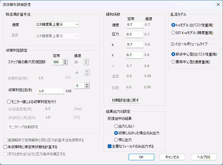 それぞれの計算で、各物理量の増分が計算されます。増分に緩和係数をかけて、各物理量を更新します。 これにより、計算の発散を防ぐことができます。 緩和係数は小さいほど発散しにくくなりますが、反復回数が増え、計算に時間がかかります。 定常解析と過渡解析で異なる値を設定することができます。