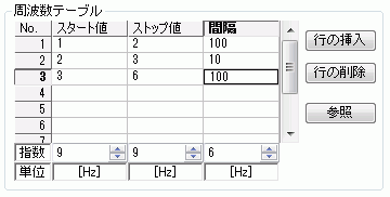 スタート値からストップ値までを指定した間隔で等間隔にスイープさせます。 複数行の定義が可能ですので、間隔が可変です。 [参照]ボタンを押すことで、Excelファイル(csv)から入力が可能です。 また、テーブルはコピー&ペーストに対応しています。