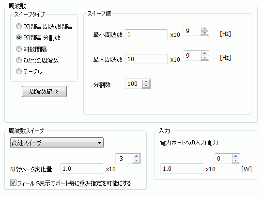 いずれのタイプも周波数に入力できる値は0より大きい実数です(0は含まない)。 必ず最大周波数 ≧ 最小周波数 となるように値を指定してください。 また、最大周波数= 最小周波数の場合は、単一周波数での解析となります。