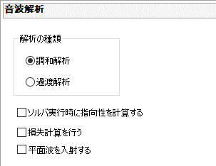 調和解析でのみ使用できます。 チェックを入れると、音波指向性計算タブの入力が可能になります。計算する指向性の内容は、以下の通りです。