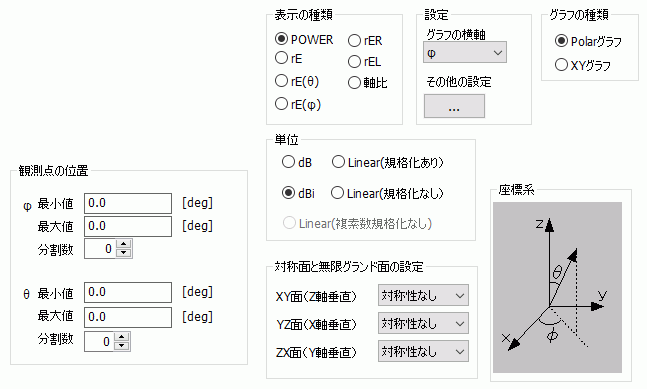 設定項目の説明は、結果表示/特性値(チャート)/指向性/[詳細モード]電磁波指向性計算 ページに詳しいですので、ご覧ください。
